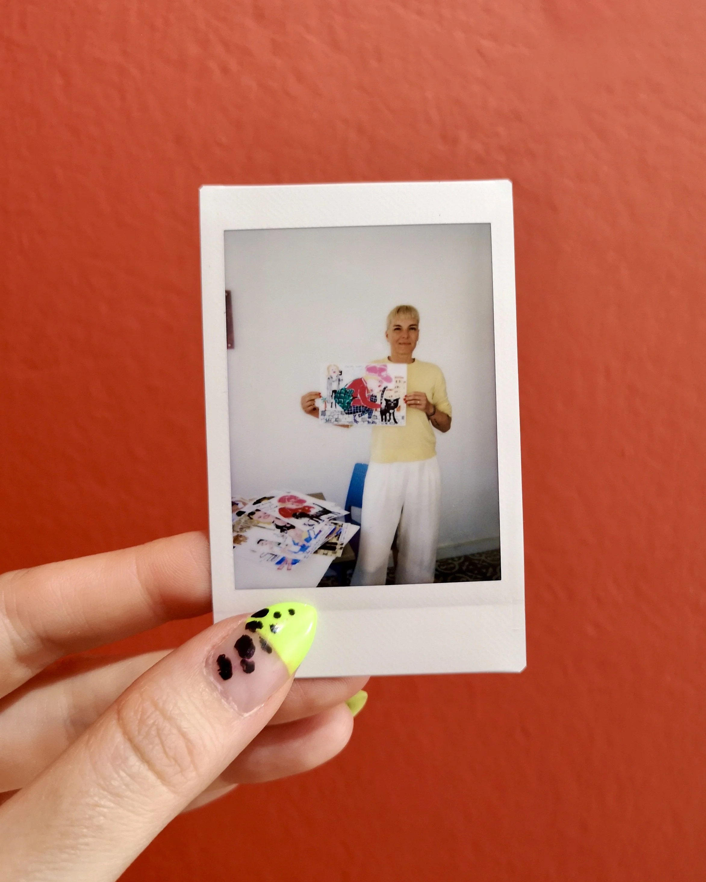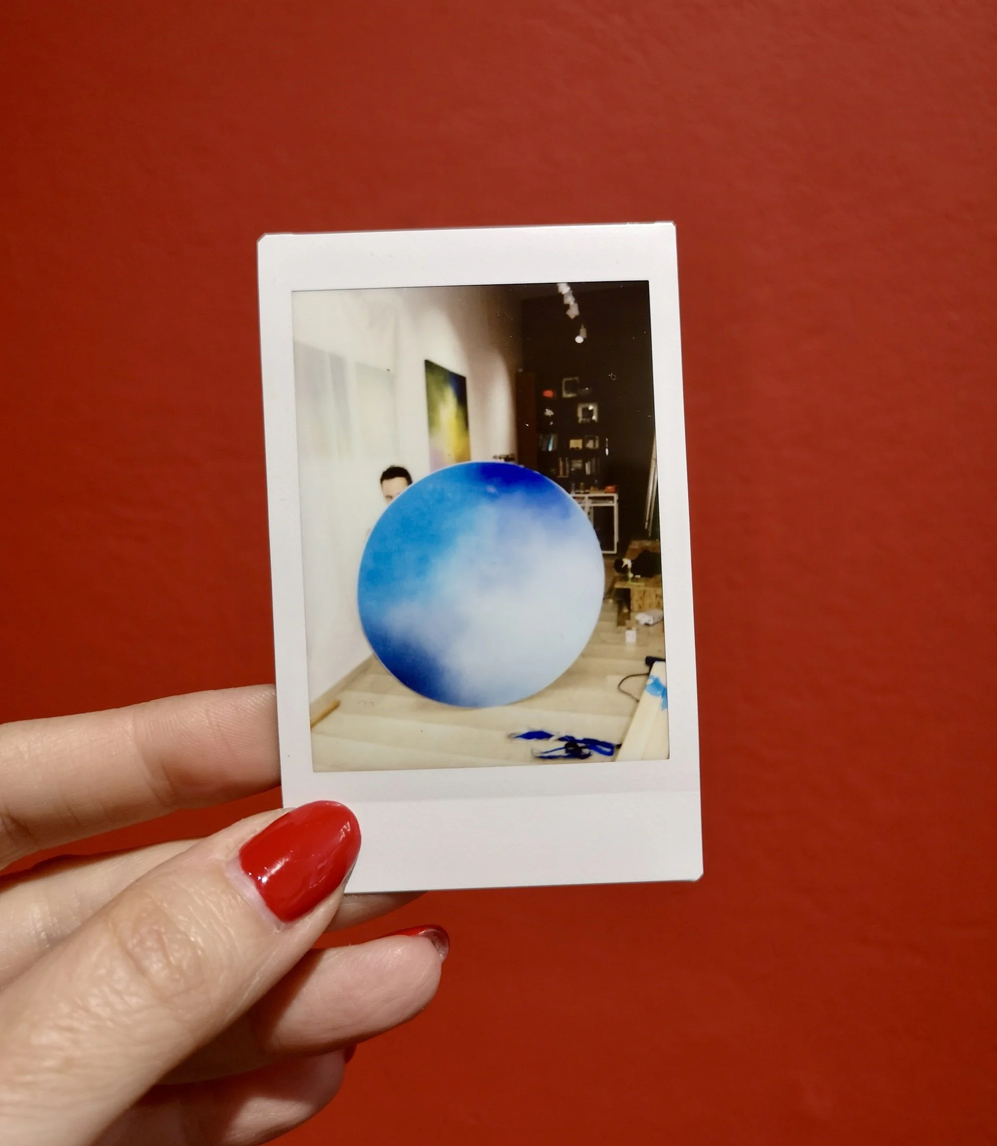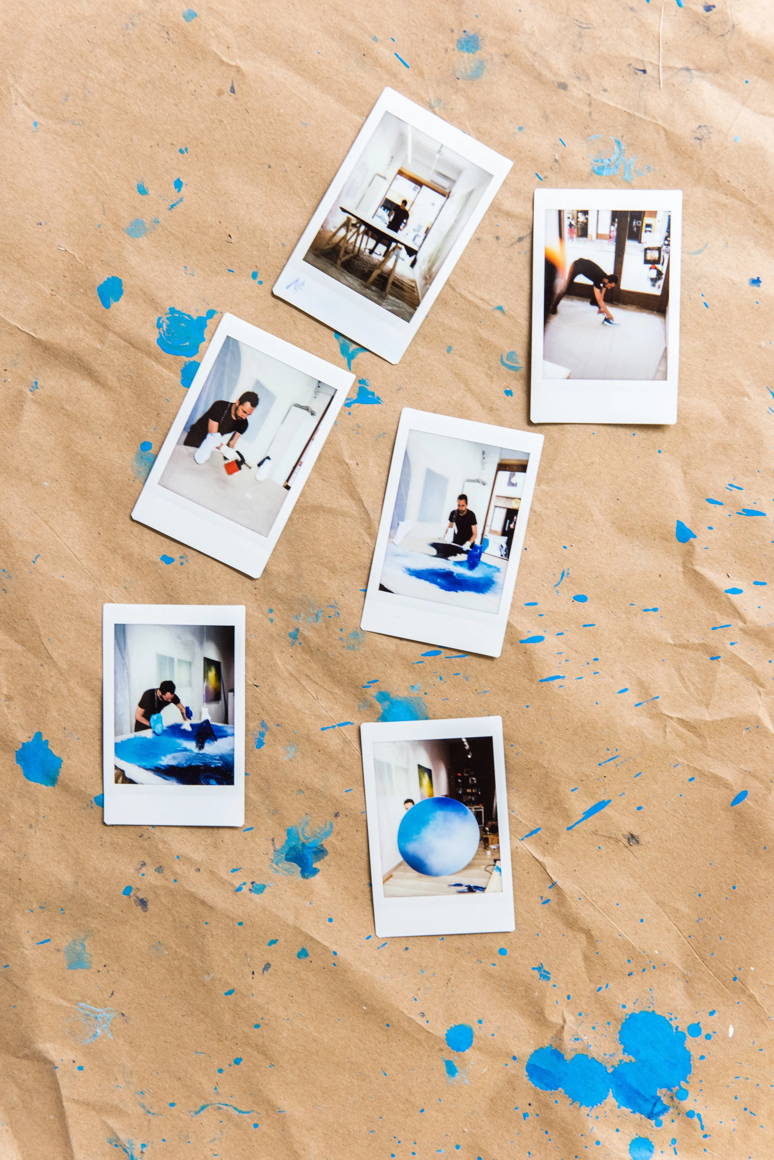 Mattia Novello creating his latest round painting in the RedD Gallery. Polaroids by Denia Kazakou. Photo by Andreas Markakis.